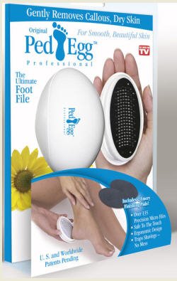 The Deluxe PedEgg is the revolutionary foot file that you've seen nationally advertised on TV. It's the newest and fastest way to make your feet feel smooth and healthy with NO MESS! The secret is PedEgg's precision micro-files that gently remove calluses and dead skin to give your feet the incredible baby soft look and feel that everybody loves. Two high quality emery buffing pads are included for the ultimate finishing touch. The unique egg shape of the PedEgg not only looks great, but is ergonomically designed to fit perfectly into the palm of your hand for easy and convenient use. Best of all, PedEgg has been designed to collect all the skin shavings in a convenient storage compartment allowing you to use it anywhere with no mess. You and your feet will love the new PedEgg! Includes 2 Buffing/Polishing Pads FREE! + FREE 1oz MIRACLE FOOT REPAIR CREAM + + 3PK Replacement blades for use with Ped Egg